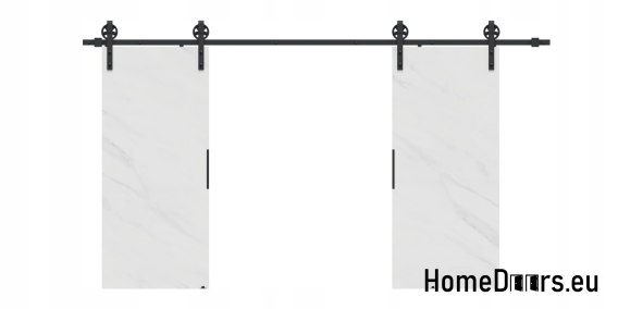 W zestawie otrzymujesz kompletne drzwi przesuwne 140 cm – skrzydło w kolorze Marmuru Białego + czarny system przesuwny LOFT 04 + uchwyt i prowadniki.