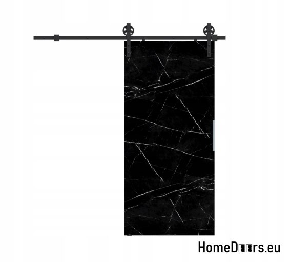Le décor comprend une porte coulissante complète de 85 cm – à feuilles en marbre noir + système coulissant LOFT A-04 noir + poignée et chaînes.